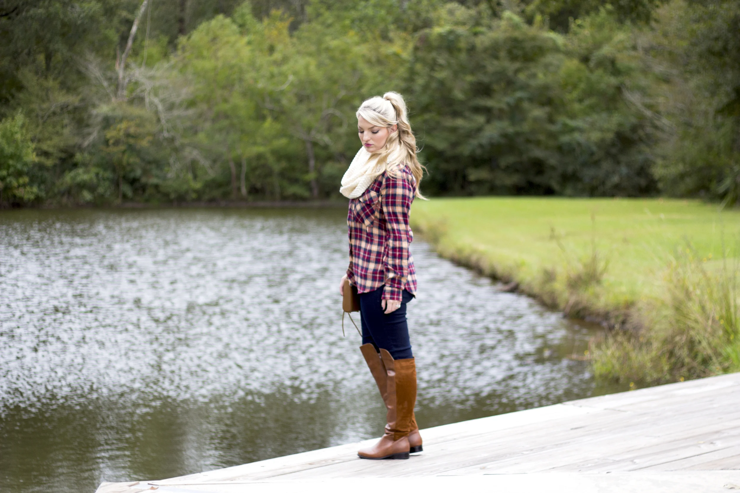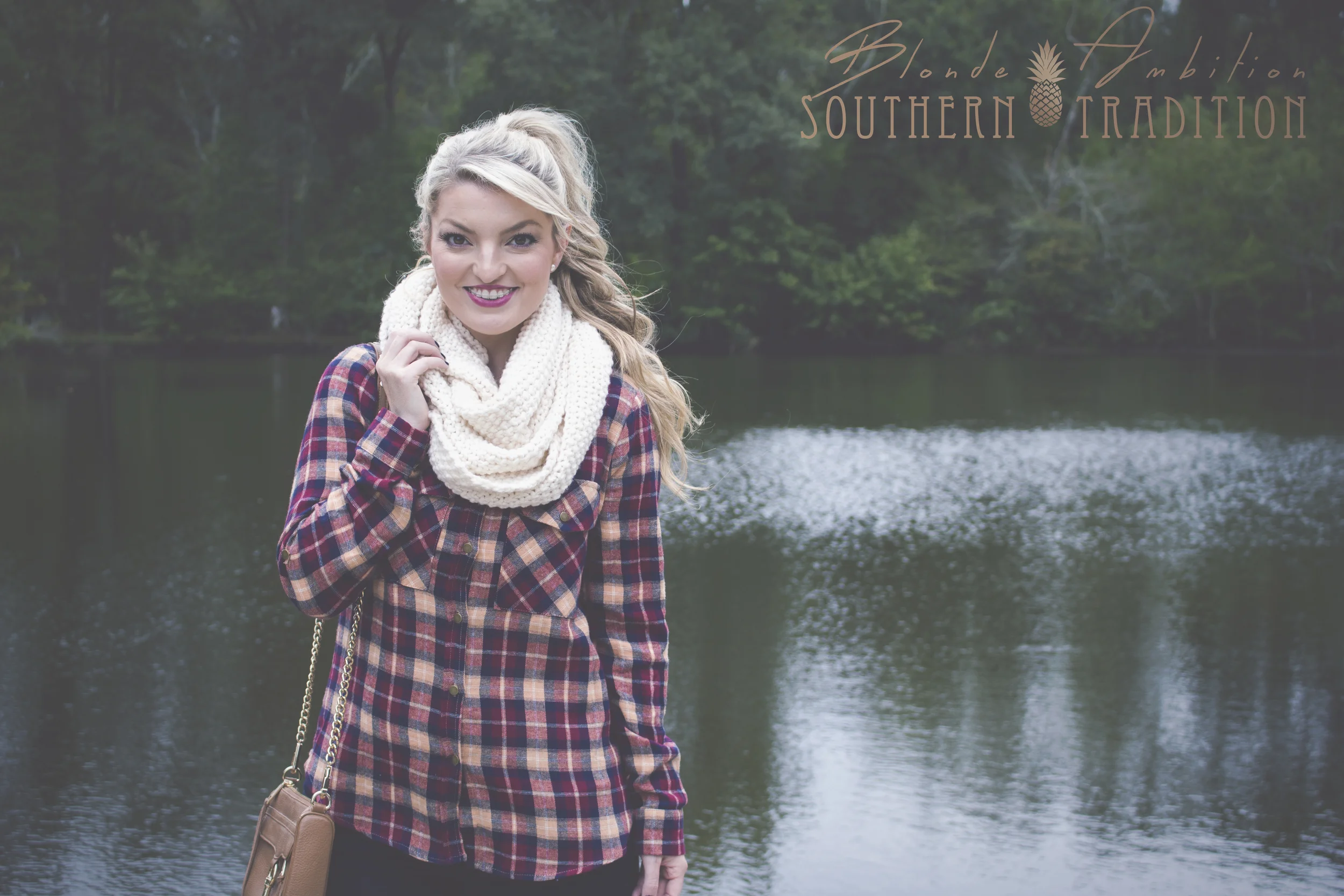 Now let's get to it! Fall and flannel go hand and hand! It is the perfect combination of function and fashion! In this weeks post I want to show you one of two ways that I wear my favorite flannel shirt! My flannel shirt was a recent purchase from Nordstrom. My husband actually picked it out for me and boy was he spot on! I adore the color and shape of this button up flannel. One of my favorite ways to wear flannel is to add a giant chunky scarf to it! There is something about a pretty cream knit that screams luxury to me! My scarf is from Gap and is perfect for layering! As much as I love chunky scarves they always create a bit of a hair crisis for me. My solution is a high curly ponytail! I rarely wear my hair up, but for the sake of this look it works. My dark denim skinny jeans are the perfect basic to accompany this gorgeous plaid flannel and my over the knee boots. Which brings us to my boots! These bad boys have become my favorite fall shoe! I purchased them last year at the end of winter from from Altar'd State. I am in love with them and wear them all the time now! My bag is a Rebecca Minkoff Mini M.A.C. in cognac! This outfit is so comfortable and perfect for a fall day!