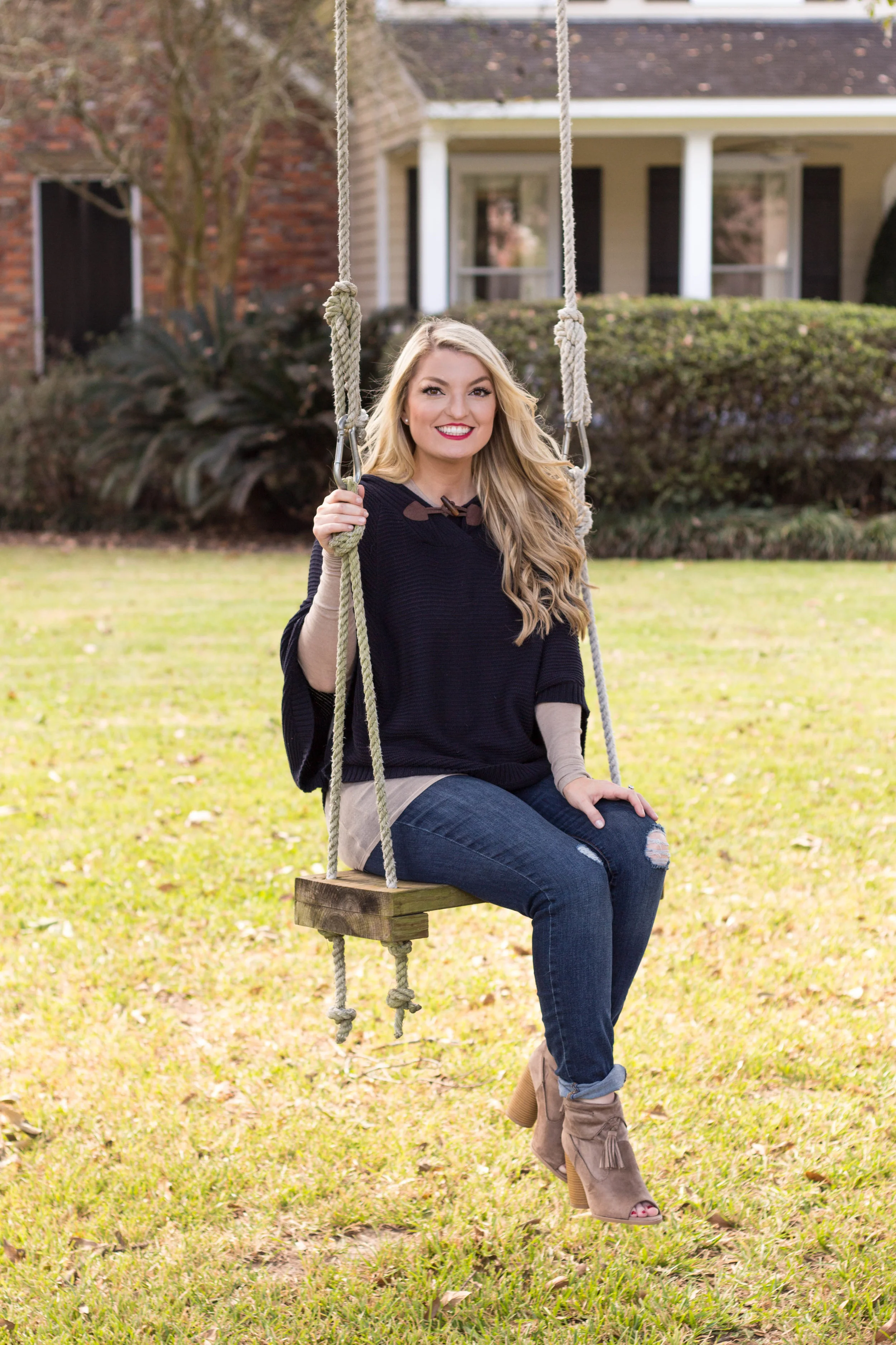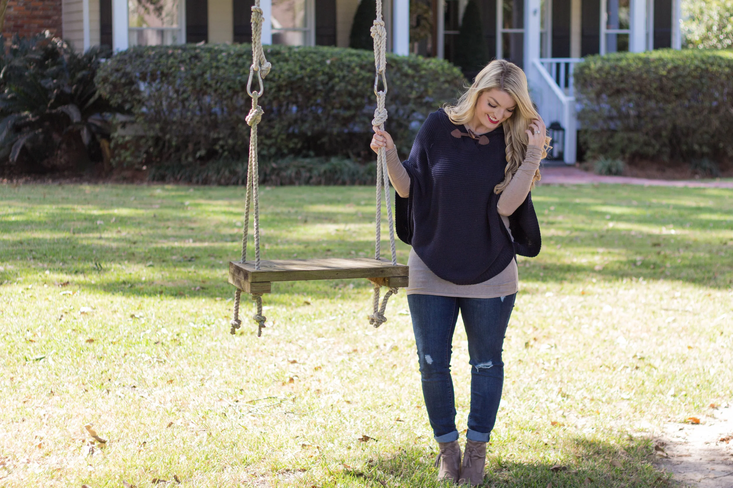 Lets jump into this outfit! So what makes a good Thanksgiving Day outfit? In my opinion an oversized top is a must. This outfit is a great example of what I would wear to my family's big turkey feast. My oversized cape is perfect for hiding a turkey belly! I also love the hood on the back of it. I have layered a thin knit BCBG sweater under my cape for warmth, and wore my favorite distressed jeans.