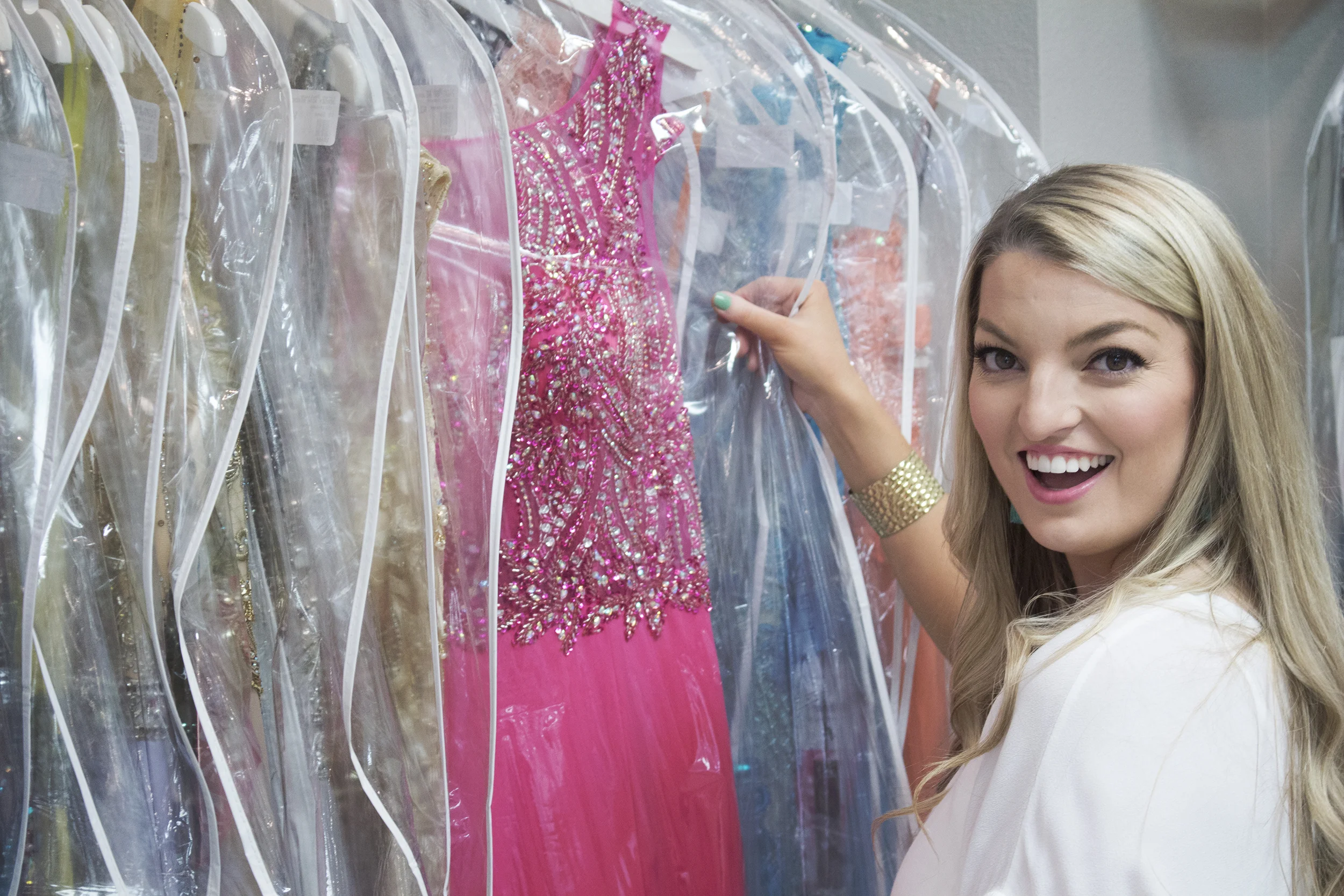 My favorite section of the store was the formal wear section. Since my heart beats widely for rhinestones, chiffon and an evening clutch, this area was right up my ally! Each dress is individually stored in its own garment bag to protect the integrity of the intricate details of the gowns. I drooled over each jeweled covered dress wishing I had a reason to buy a formal gown!
